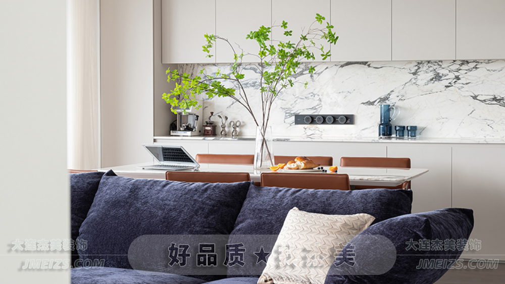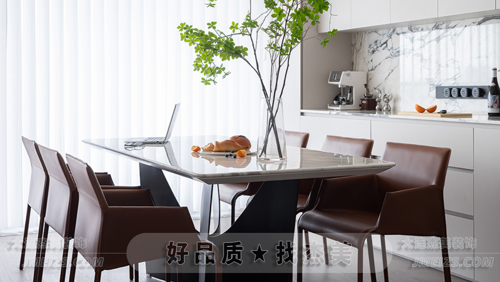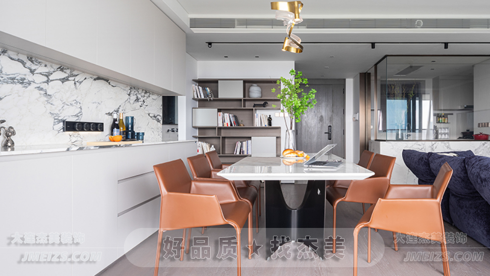 燈光的設計也是廚房與餐廳設計中不可忽視的部分。在這個廚房與餐廳中,大連杰美裝修裝飾設計師運用了吊燈、壁燈和臺燈等不同類型的燈具,創(chuàng)造出了豐富而舒適的光環(huán)境。吊燈可以提供明亮而集中的光線,用于照亮需要重點照明的地方,如餐桌和廚房操作臺等。壁燈則可以提供柔和而均勻的光線,用于照亮整個空間。臺燈則可以提供明亮通透的光線,用于創(chuàng)造舒適和溫馨的氛圍。