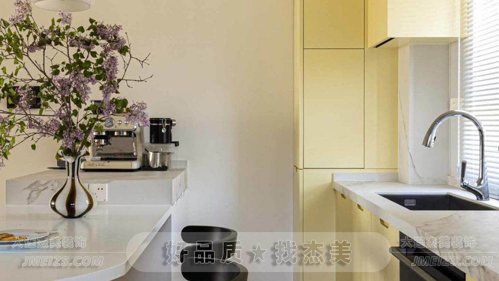 廚房是一個開放式設(shè)計,與餐廳保持互通。設(shè)計師在這里選用了與玄關(guān)柜同色的奶油黃櫥柜,視覺效果上的呼應(yīng),造就空間體系的完整。廚房儲物空間被臺面自然地分為上下兩個部分:凹槽開合、根據(jù)臺面功能進(jìn)行分區(qū)收納的地柜;造型輕盈、排列整齊、柜面統(tǒng)一的吊柜,承擔(dān)了不同的儲物功能,讓廚房保持高度的整潔度和秩序性。