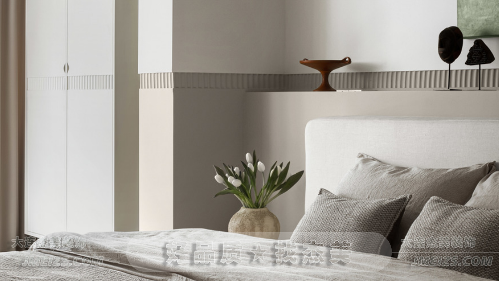 床頭的半墻延續(xù)了整體空間的風(fēng)格,淺色系的設(shè)計(jì)為空間增添了層次感。整體搭配簡約和諧,也便于使用日常物品。