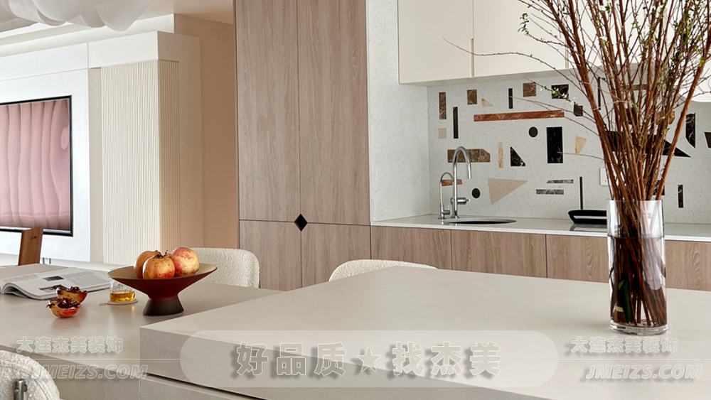 我們喜歡選擇島臺與餐桌相連,這種設(shè)計方式仿佛在空間中留下了雙動線的魔力,讓人陶醉其中。