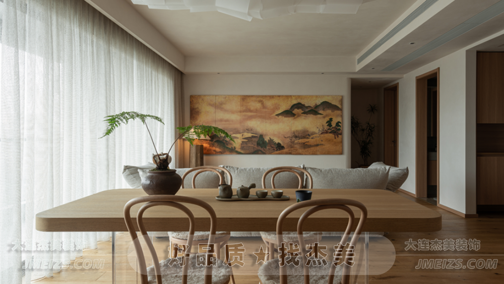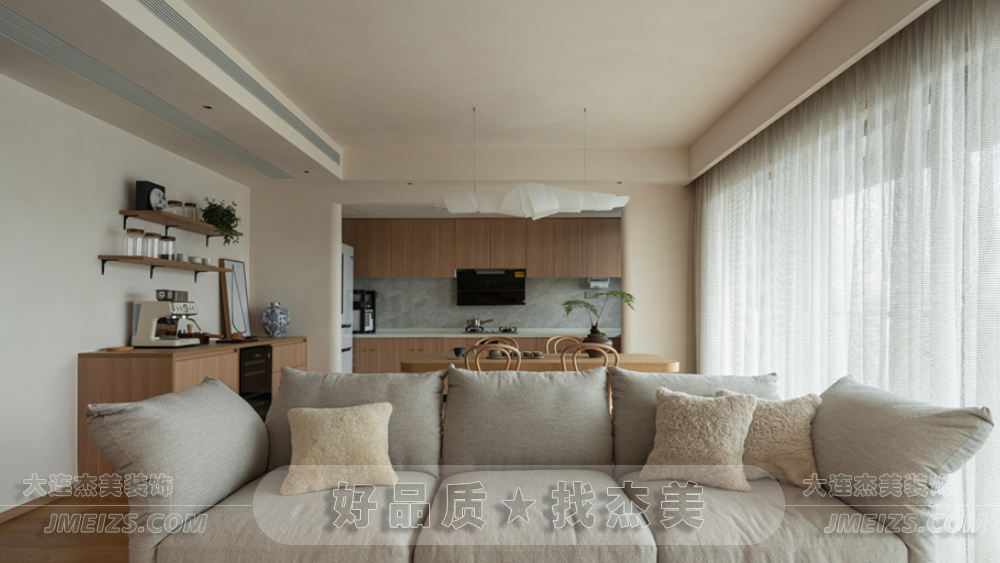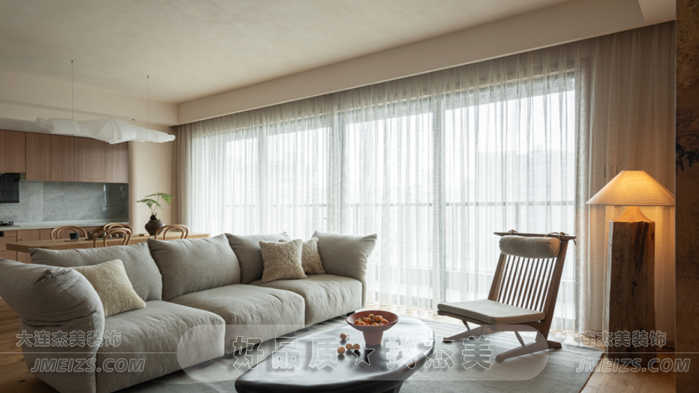客廳的設(shè)計(jì)靈感來源于日式的禪意和自然。一體化的開放式客餐廳,雖然與傳統(tǒng)日式有所不同,但卻更加空靈和寧靜。