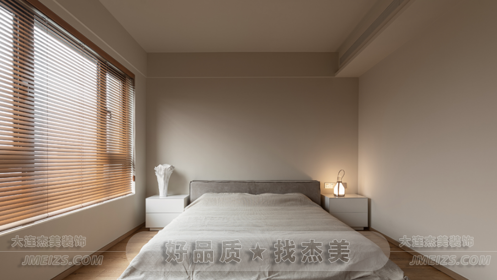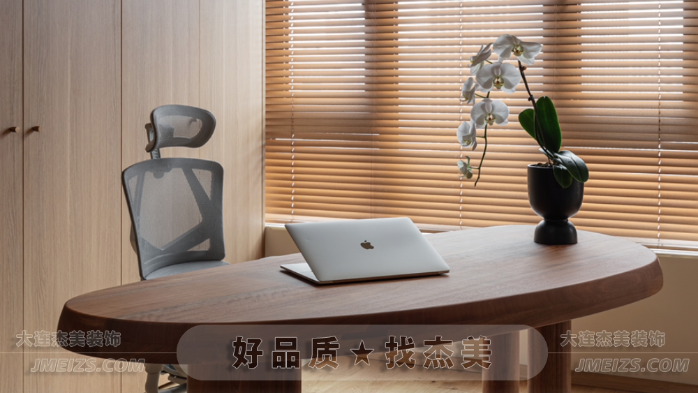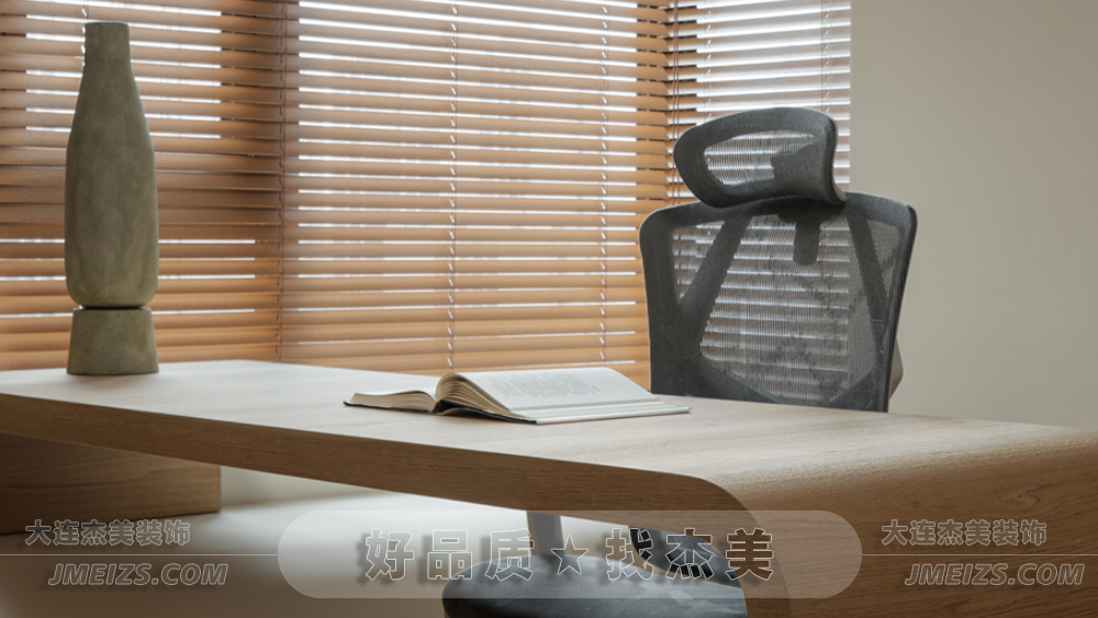 整個(gè)主臥的設(shè)計(jì)都圍繞原木風(fēng)格進(jìn)行。原木色的百葉窗為空間增添了一絲自然和溫馨,而桃花芯木制成的書桌則為其增添了一絲柔和和雅致。