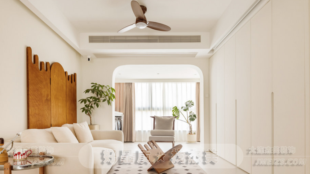 淺色地磚通鋪地面,奶白色系的墻面統(tǒng)一提升了空間的整體質感。簡約的吊頂搭配復古實木風扇燈,既展現個性,又實用實用。