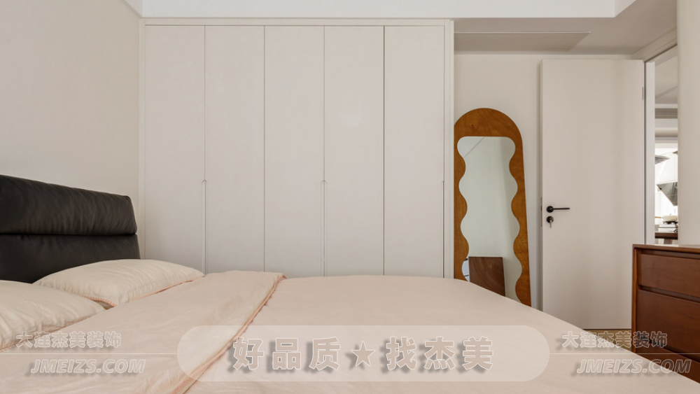 主臥的設(shè)計充分展現(xiàn)了原木與奶油白風格的魅力。墻面和衣柜柜體顏色統(tǒng)一,呈現(xiàn)出一種寧靜和諧的氛圍。
