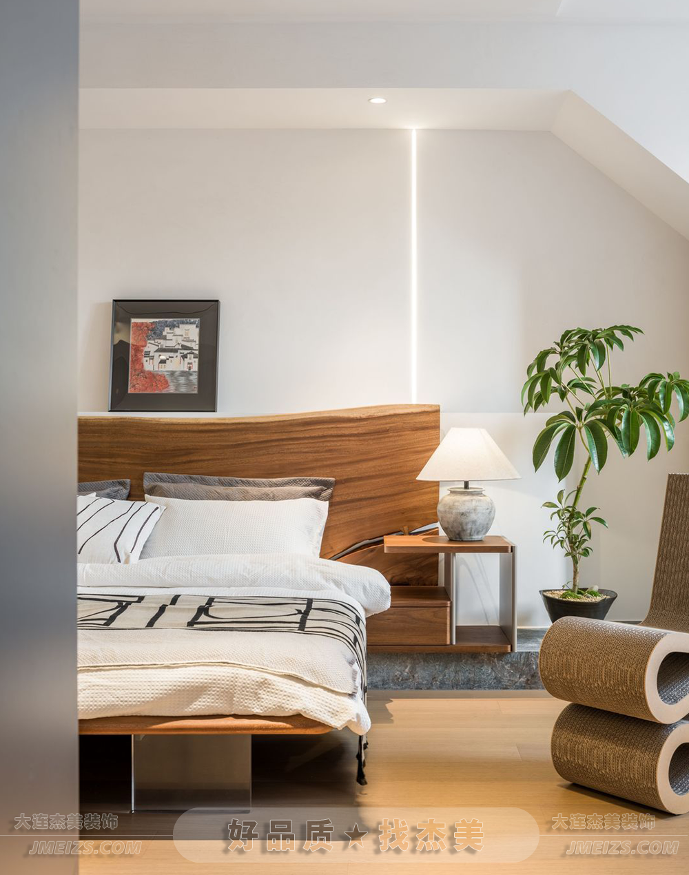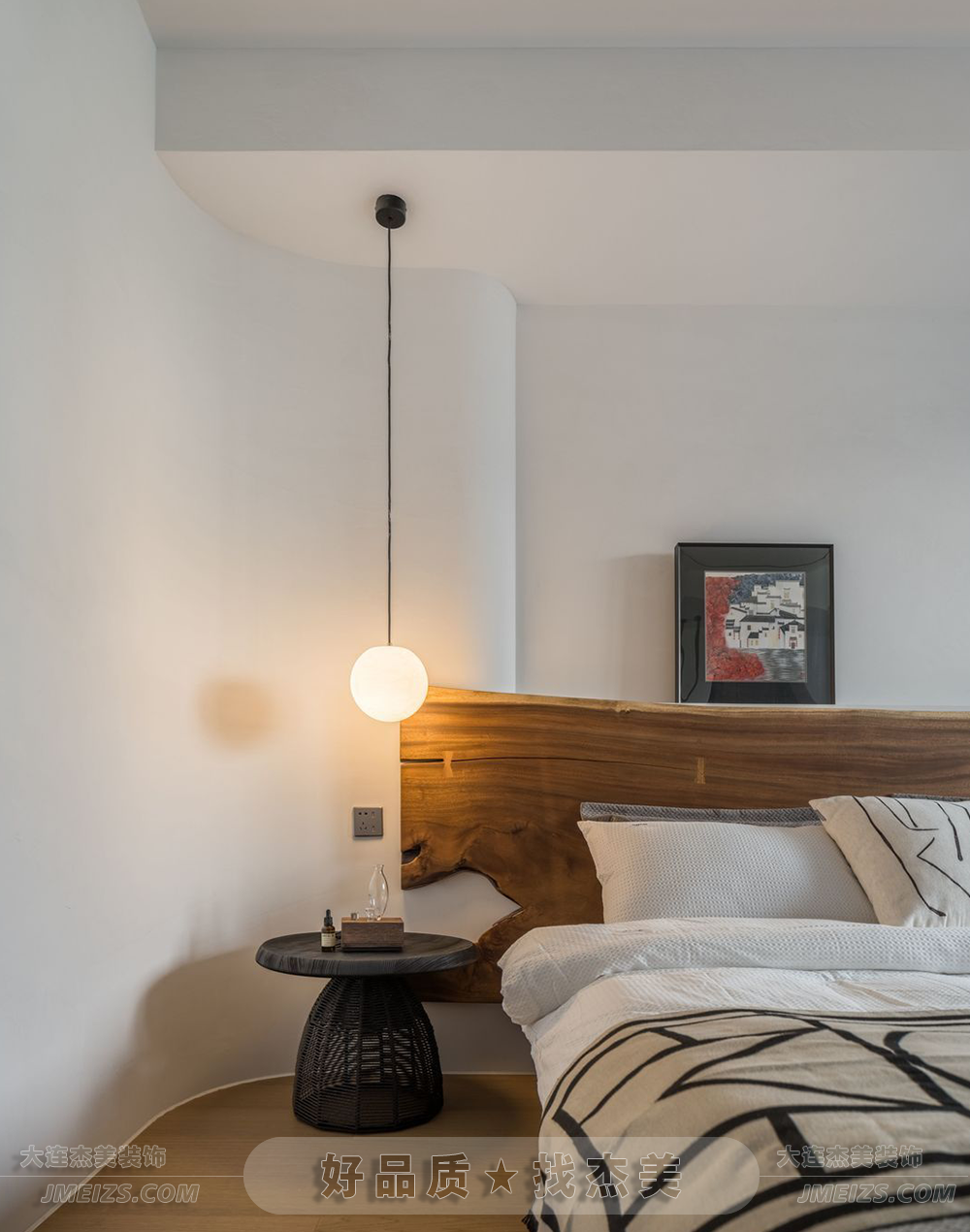 主臥設(shè)計(jì)給人一種寧?kù)o自然的感覺。床頭采用了原生態(tài)的實(shí)木,懸浮的床架設(shè)計(jì)非常特別。此外,浴缸也被設(shè)計(jì)在主臥內(nèi),增加了空間的多功能性。