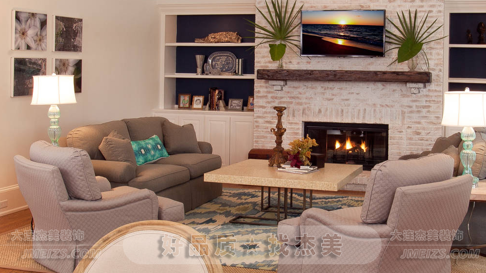 融合現代與古典風格的開放式客廳,大連杰美裝修設計師通過色彩、軟裝和細節(jié)處理,打造出舒適優(yōu)雅的起居氛圍。