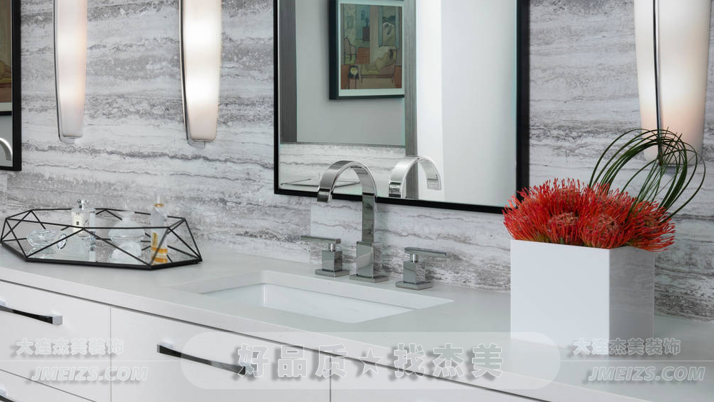 大面鏡擴(kuò)大空間感,帶來明亮照明效果。金屬質(zhì)感水龍頭與自然紋理灰色石材洗面盆契合簡(jiǎn)約風(fēng)格。