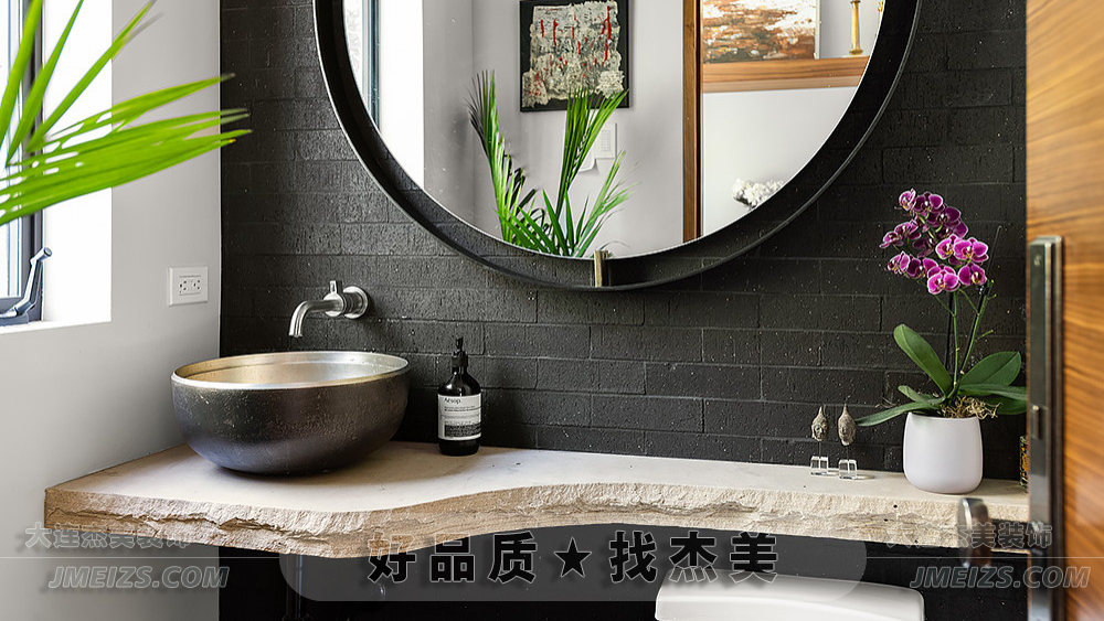 本案洗漱間是一個(gè)完美融合了自然元素和現(xiàn)代設(shè)計(jì)的空間。