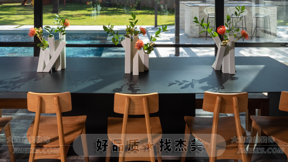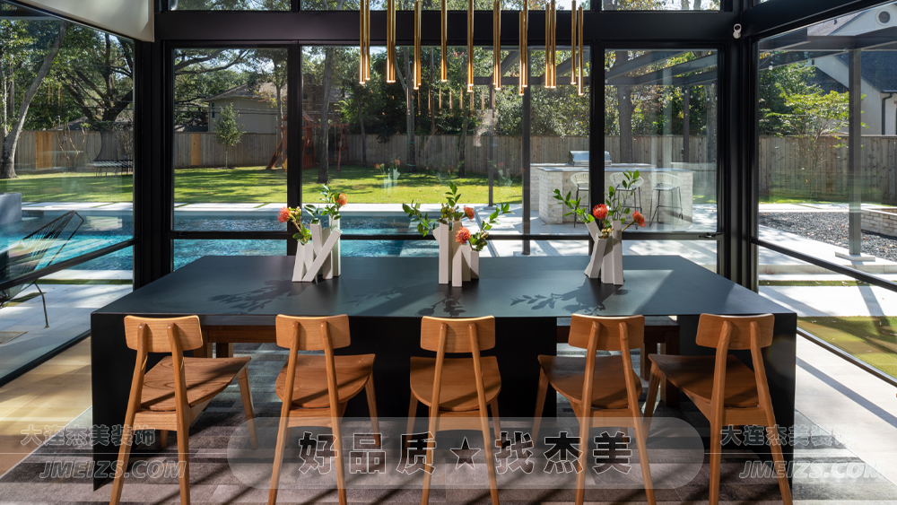 餐廳的設(shè)計(jì),充分考慮了與自然的關(guān)系。三面的落地窗,使餐廳與外界的自然景色完美融合,為家庭成員提供了一個(gè)與自然親近的用餐空間。綠樹、陽光、藍(lán)天,每一餐都仿佛在大自然中享受,使用餐變成了一種與自然親近的體驗(yàn)。
