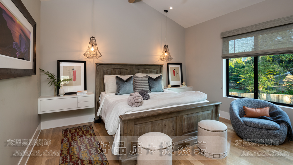杰美裝飾以暖白色調(diào)為整個(gè)臥室?guī)砹艘环N溫馨而又舒適的感覺。這種顏色不僅能夠放松身心,還能為人們帶來一種寧靜和平的感覺。