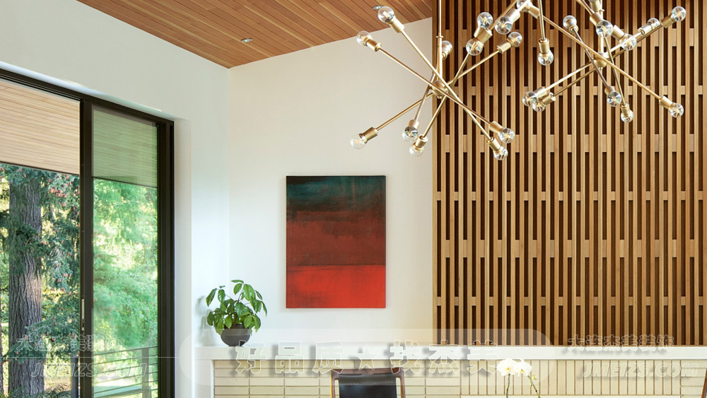 木質(zhì)的天花板板條呈現(xiàn)了溫暖的色調(diào)和細(xì)膩的紋理,