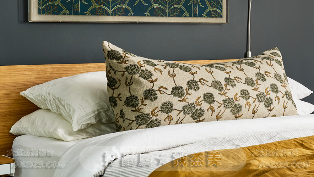 床鋪上,米白色的床品和繡花長(zhǎng)枕承載著細(xì)膩的生活感,