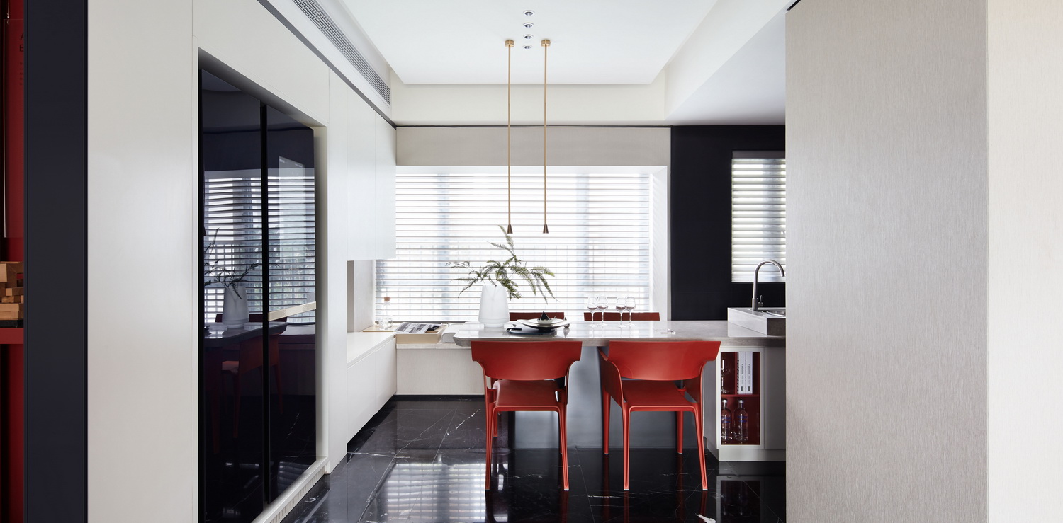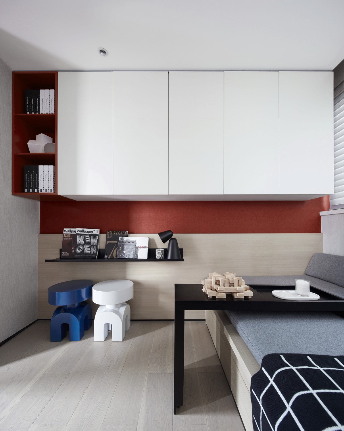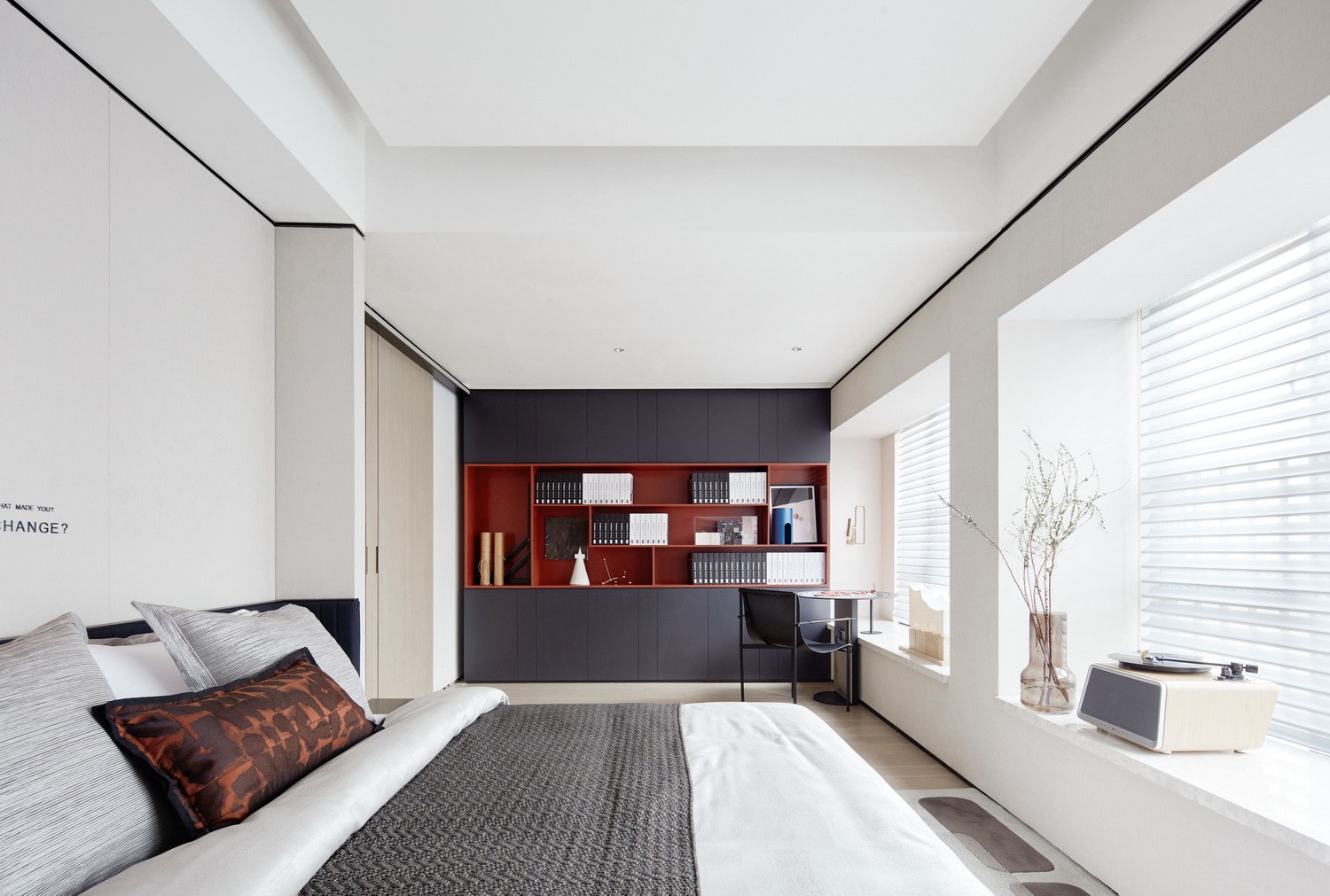 走進臥室,仿佛踏入一方寧靜素雅的天地。與外面的多彩形成鮮明對比,這里以純凈的白色為主調,營造出一種平和安寧的氛圍。紅黑底色的書柜和書桌,為這份素雅增添了一抹沉穩(wěn)與個性。窗戶是臥