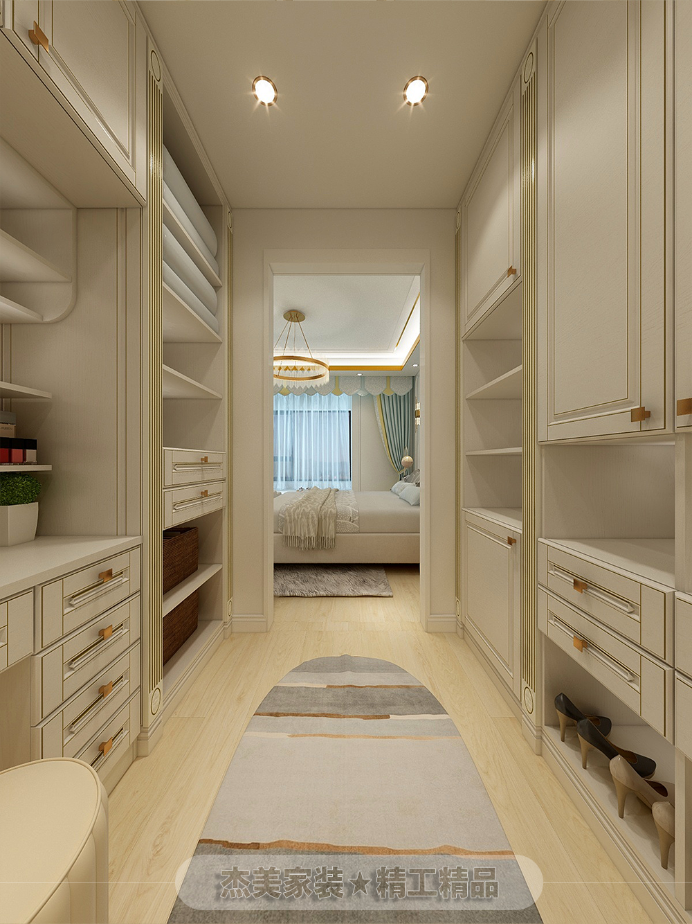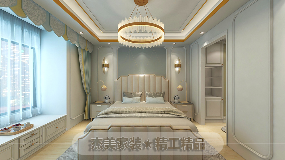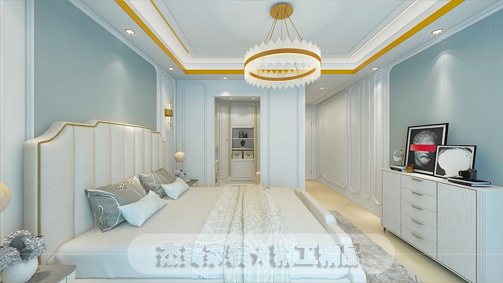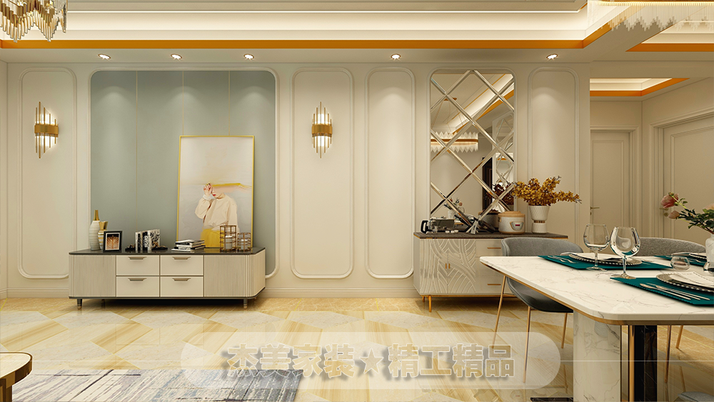 簡約法式輕奢,包含法式的原素,線條,結(jié)合現(xiàn)代的表現(xiàn)手法,是空間變換成另一種不一樣的風(fēng)格,讓居住在這個空間的主人有一種高貴的感覺,墻面圓弧的素線條簡單的把法式的元素體現(xiàn)出來,再加上硬包,直線形式又有現(xiàn)代感覺,給人感覺不會那么老套,天棚采用現(xiàn)代直線吊頂加上金色金屬線條體現(xiàn)出高貴的感覺。